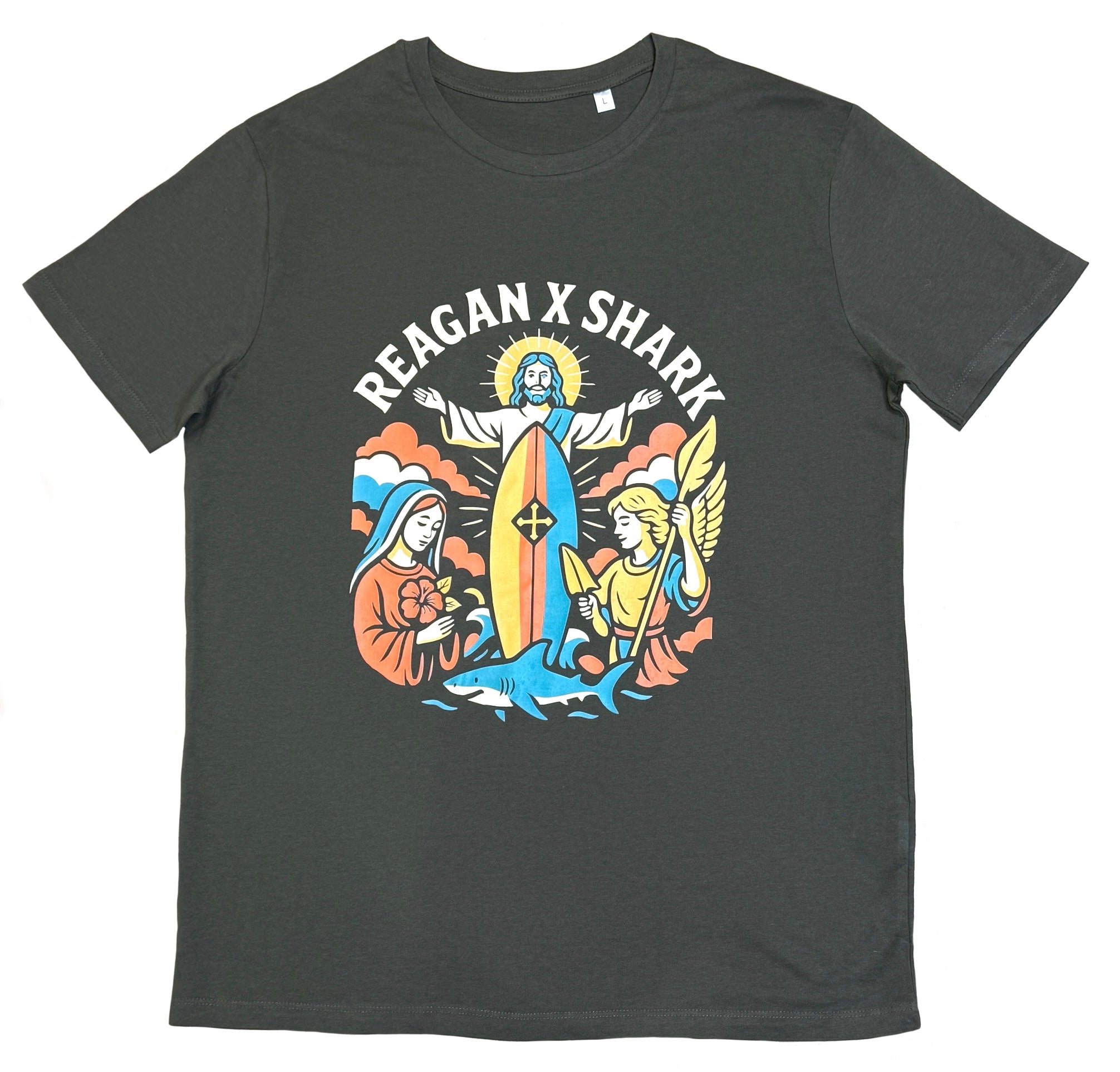 Love’s a crusade, surfing’s my religion. Whether it’s a board or a cross, you follow the vibe, brother. This tee ain’t just cotton it’s a salty revelation. He rides waves, hair blowing, soul at peace