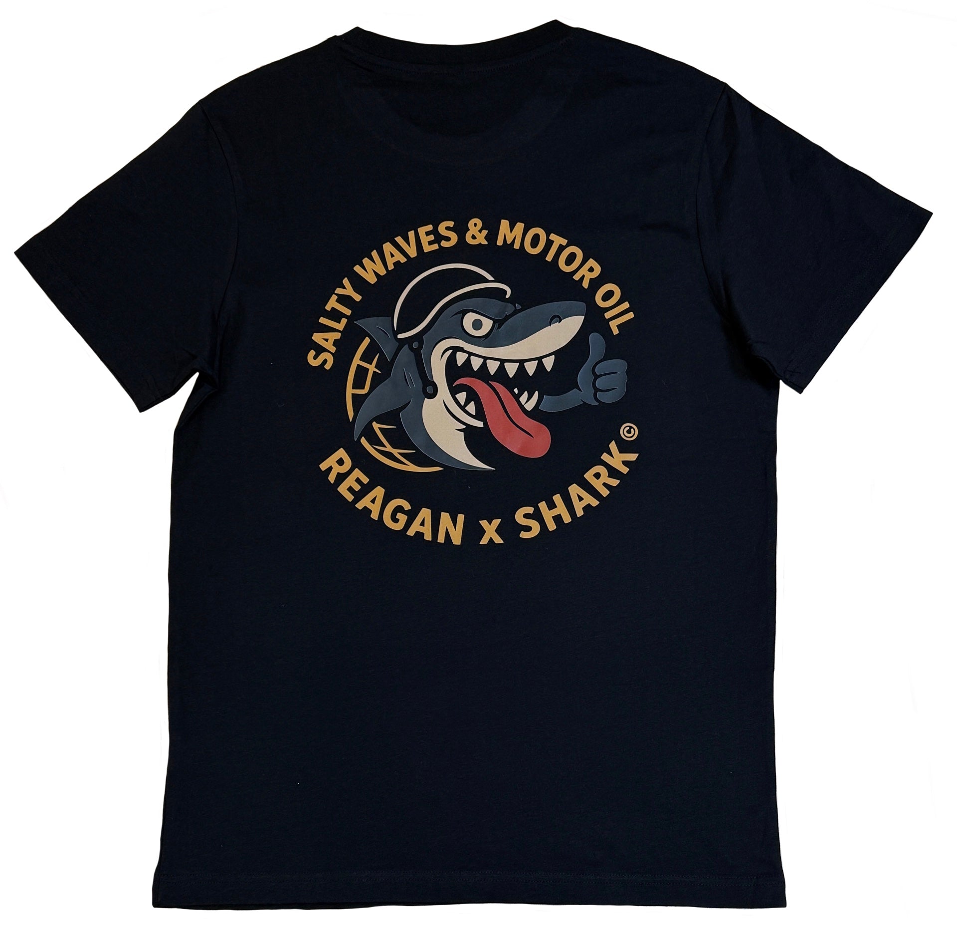 The Salty Waves & Motor Oil logo is printed big on the back just like you see in the first pic with a clean heart-side hit on the front